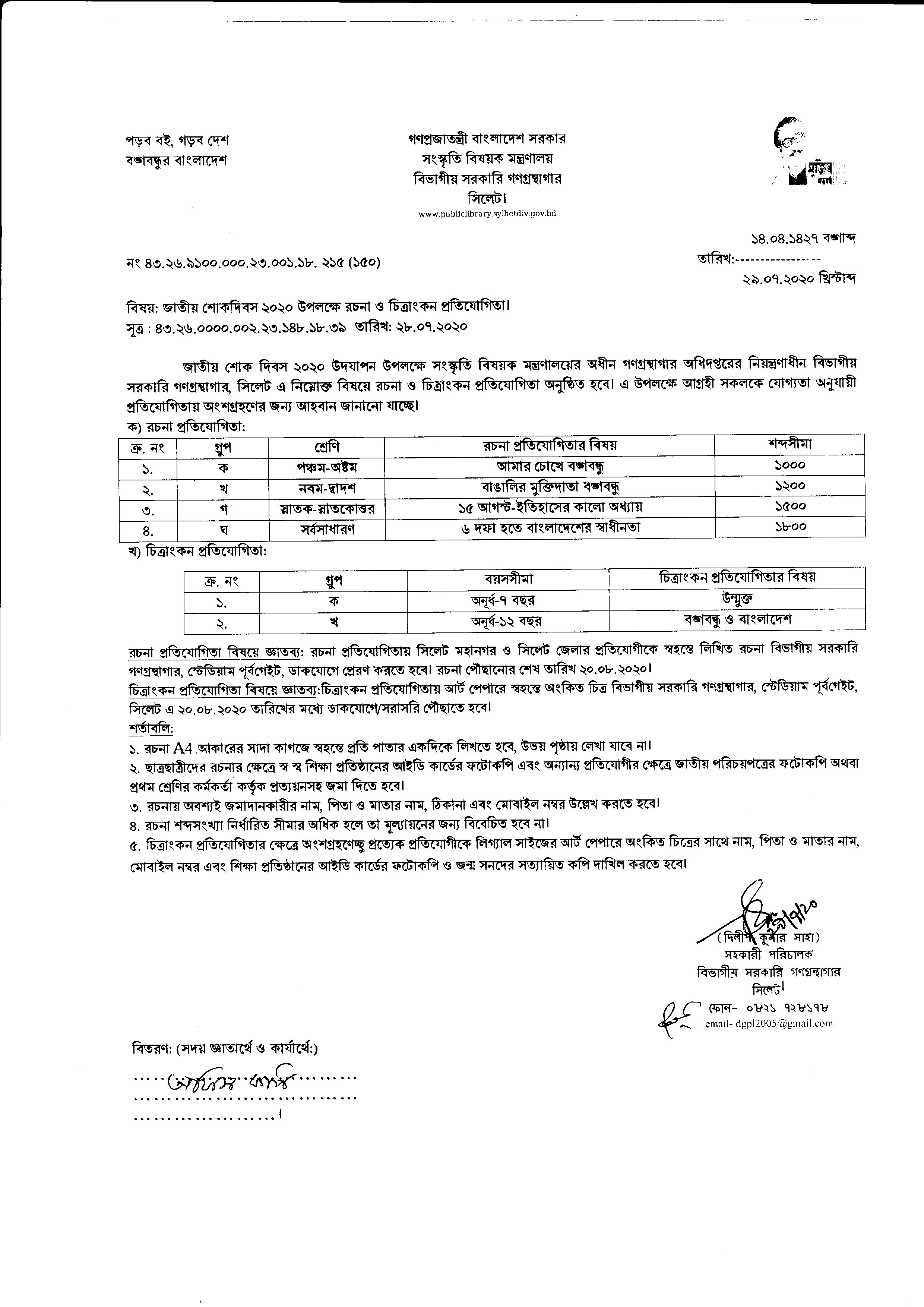 জাতীয় শোকদিবস ২০২০ উপলক্ষে রচনা ও চিত্রাংকন প্রতিযোগিতা