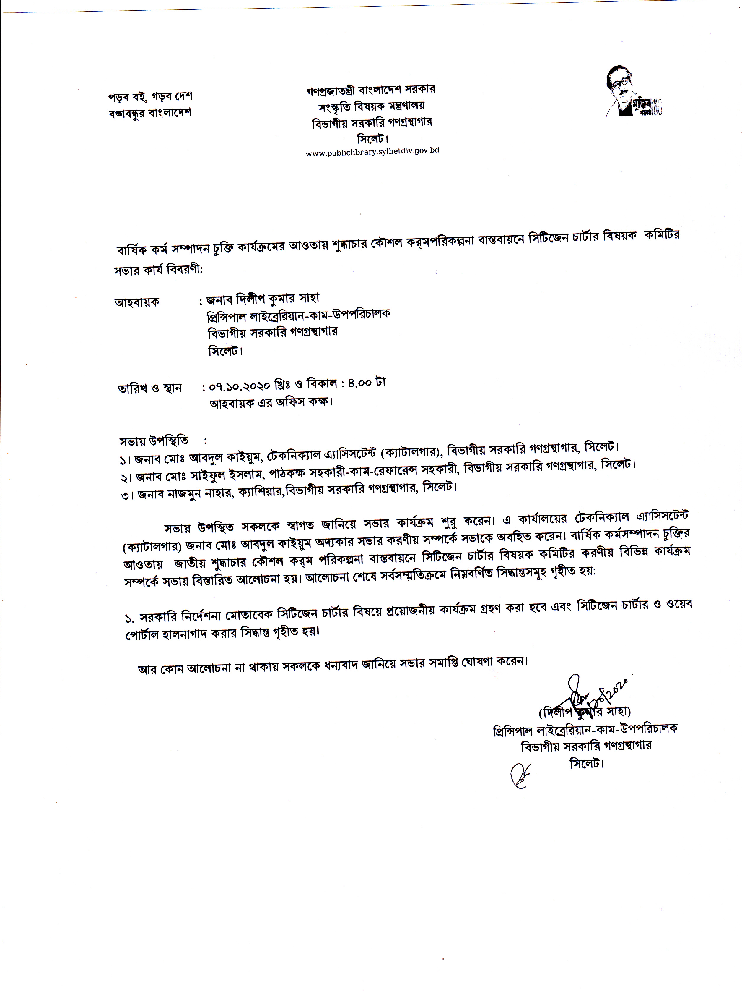 সিটিজেন চার্টর বিষয়ক কমিটির সভার কার্যবিবরণী (০৭/১০/২০২০)